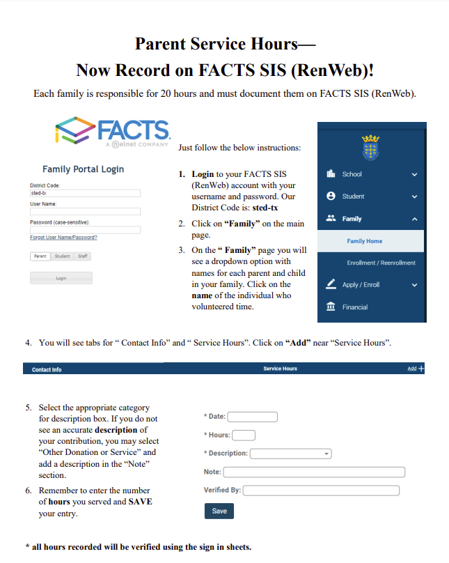 Preliminary family service hour reports for the 2023-2024 school year will be pulled this week and families showing needed hours (fewer than 20 for the family for the school year) will be contacted and given the options of either attending current volunteer opportunities to meet the hour requirement or being billed for the service hour fee.
